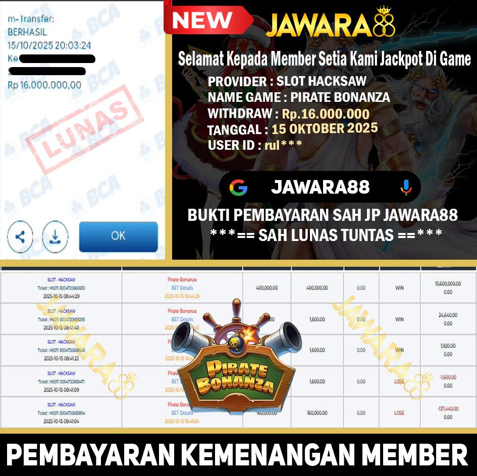 Seluruh kru dan manajemen JAWARA88, sebagai Platform Hiburan Digital Premier, hari ini dipenuhi sukacita! Kami menyaksikan secara langsung bagaimana salah satu anggota komunitas kami berhasil menorehkan sejarah kemenangan spektakuler, mengamankan Jackpot sensasional saat berlayar di lautan slot penuh misteri, Pirate Bonanza!